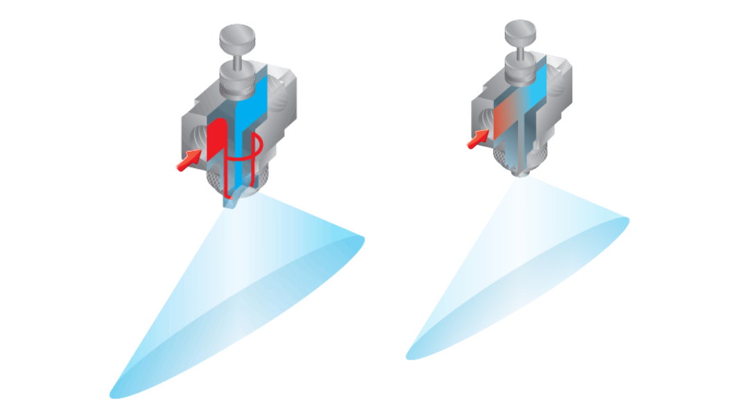 In direct pressure nozzles the energy required to break up the fluid comes from the potential energy of the fluid itself. As more energy is required to break up fluids into smaller droplets, pressure and flow rates need to be increased in order to form very fine sprays. This increase in flow rate may not be desirable as it might result in too much lubricant being delivered. Air atomising nozzles overcome this problem by using compressed air to break up the lubricant into a very fine spray. This means that even at very low flow rates fine sprays can be achieved.
