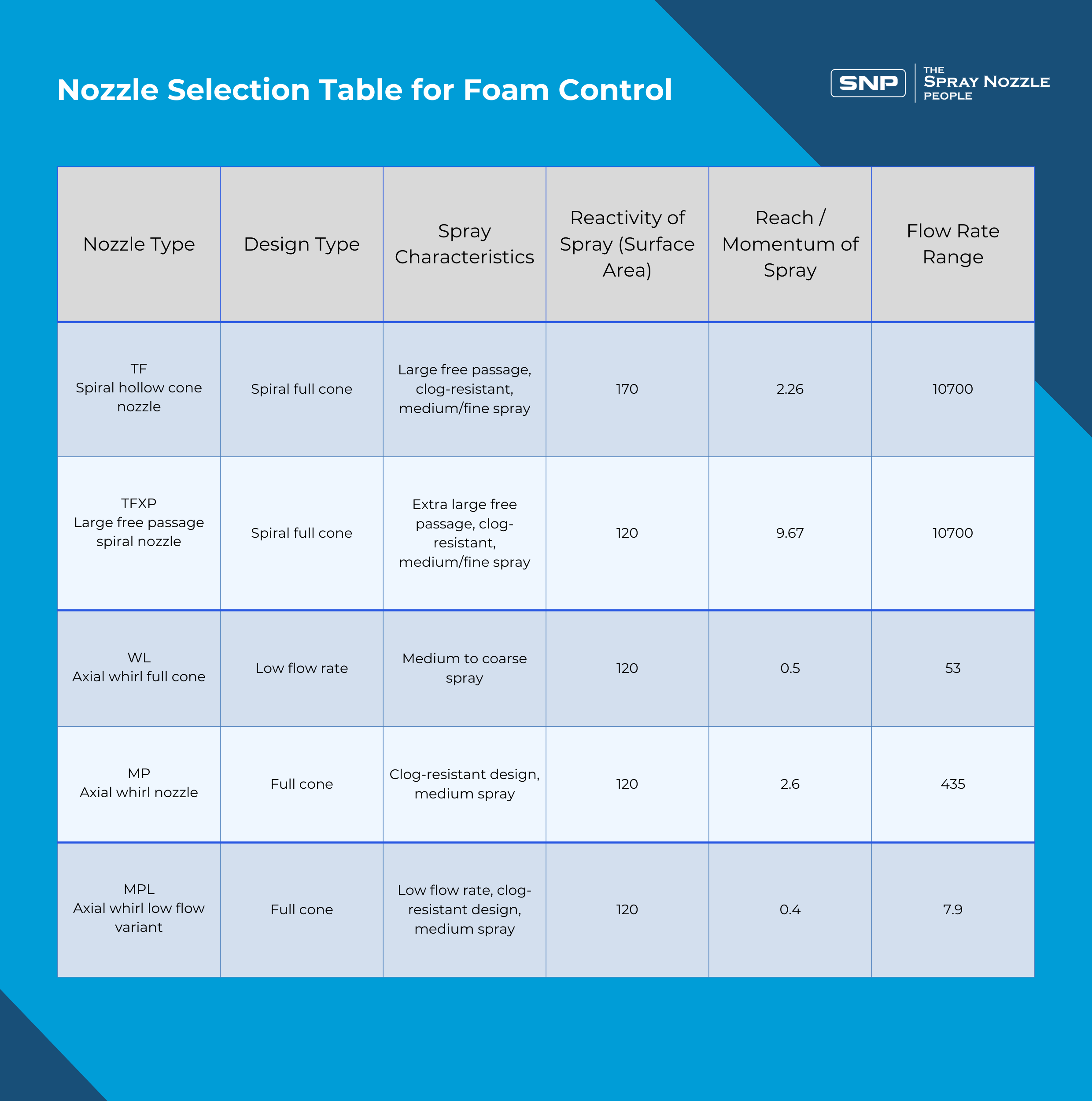 The table below summarises much of the information in the foam control nozzle section of the SNP website. It is intended to be a handy reference guide to aid nozzle selection. Full data on each of the nozzles listed can be accessed by clicking on the boxes in the left hand column of the table below. The data sheets will open in a separate tab to allow easy comparisons between multiple product sheets.