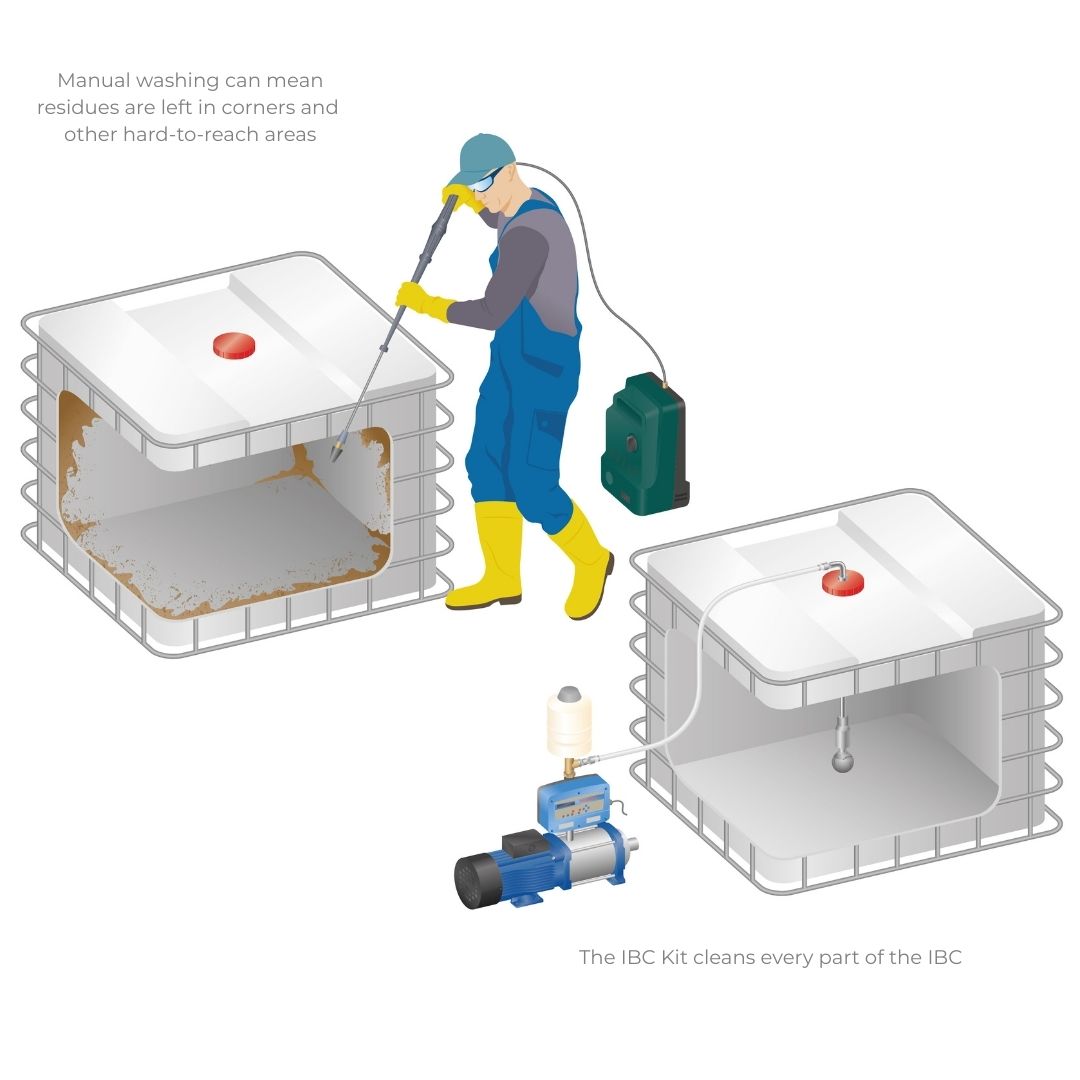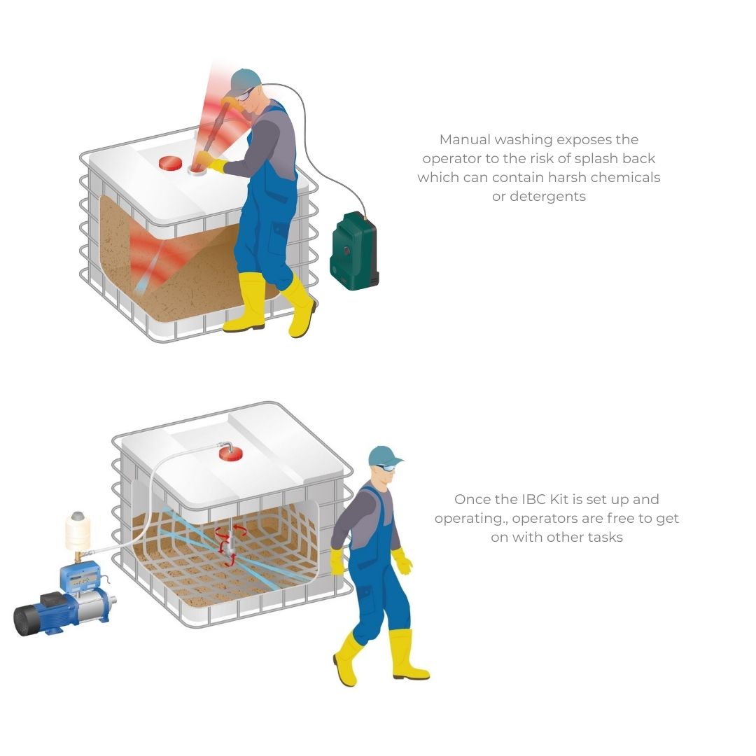 Enabling the operator to step away from the hazards associated with IBC cleaning when comparing with basic pressure washing systems. Operators are potentially exposed to splash-back spray which could contain harsh chemical residues or detergents. In addition, the operator must move around the IBC while managing the pressure washer hose and work from height leading to trip or from-height risks. Our IBC kit empowers operatives to set up and step away, significantly reducing the likelihood of such risks.