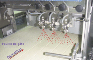 SNP engineers needed to find the best method of maintaining the moisture level of the dough throughout the various processes. Since the dough sheet was moving under the nozzles, a flat fan spray pattern was recommended as this would provide the most even and complete coverage. The finest droplet size was also specified as this would enhance droplet adherence and evenness of the coating as well.