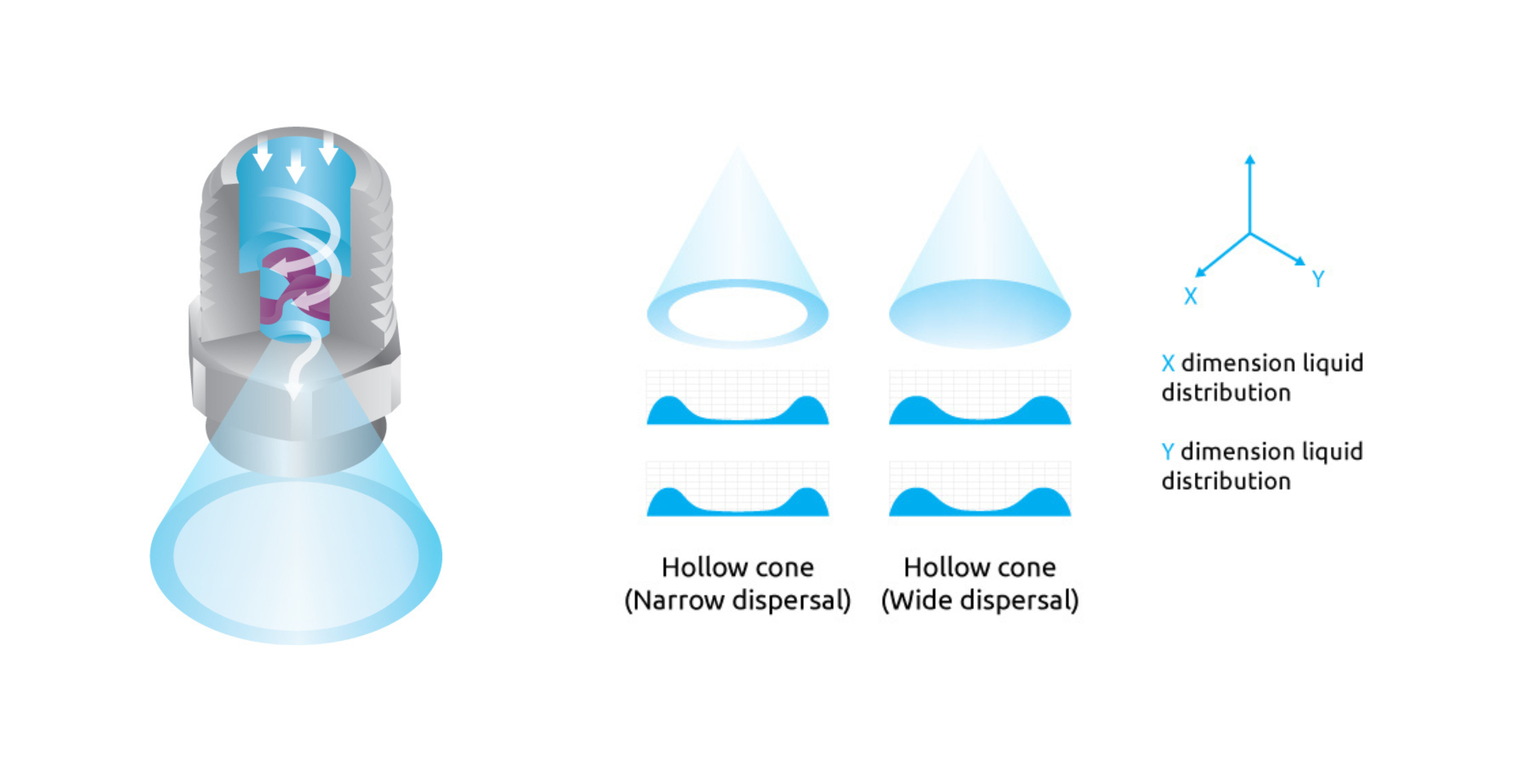 A hollow cone nozzle is defined as giving a circle of spray rather than a filled in circle of spray; all the fluid is pushed towards the edge to form a band of spray. Again, this is a low impact spray pattern. It also has the smallest
