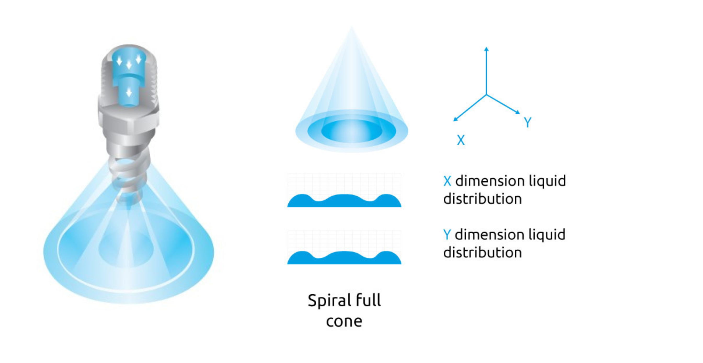 These can either produce a full cone or a hollow cone, but the pattern is slightly different; it’s derived from concentric hollow cone patterns that are formed by the spiral shape of the nozzle and the nozzle can be designed to have these concentric hollow cone patterns overlapping to form an approximate full cone pattern. But there will be considerable variation at different parts of that full cone. They can also be designed so that all the hollow cone patterns converge into one big hollow cone pattern. That could have some implications for fluid distribution.