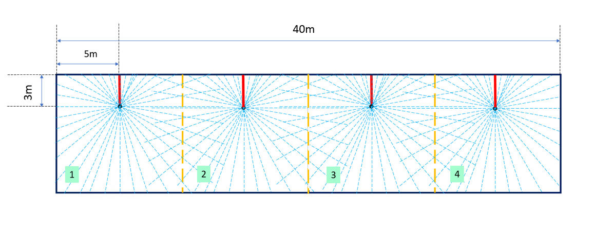 In tanks wider than 10 to 15 metres, StormBlasters may need to be installed on both sides to ensure complete coverage. In these cases, the tank is divided into virtual tanks along both its width and length. For example, a tank measuring 30 metres by 25 metres may require eight StormBlasters, each cleaning its own virtual section. This ensures that even tanks with significant width are cleaned thoroughly.