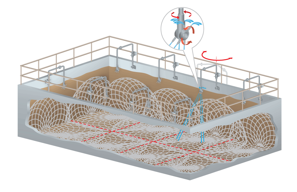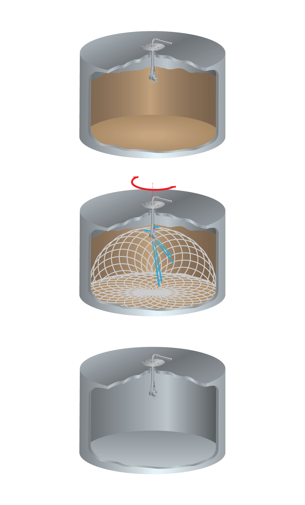 In standard tank shapes, the tank is divided into virtual sections, with each section allocated its own StormBlaster™. Units are installed either on swing arms for open tanks or through downpipes for roofed tanks.