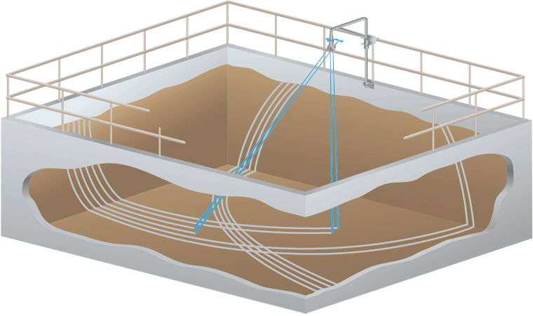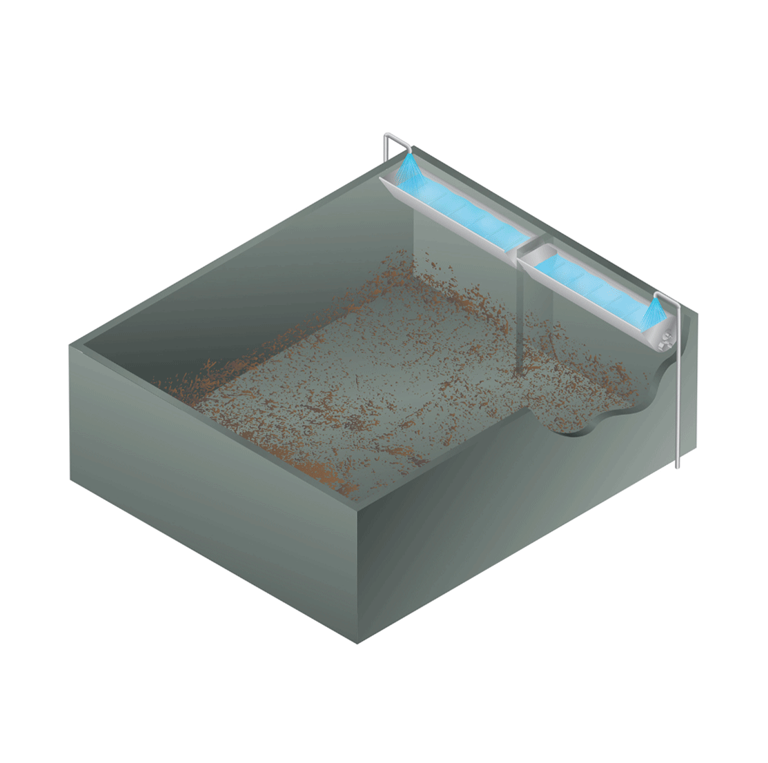 Tipping bucket systems clean a storm tank by releasing large amounts of water in a single tipping motion. The resulting surge flows across the tank floor, washing away sediment and residue. This method relies on volume and momentum to achieve its cleaning effect.
