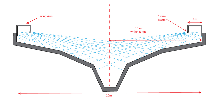 Extremely large open tanks, particularly those wider than 20 metres, can be challenging. If there is no access to both sides of the tank, the jets may not reach all areas. When access is available on both sides, multiple units can be used to achieve full coverage.