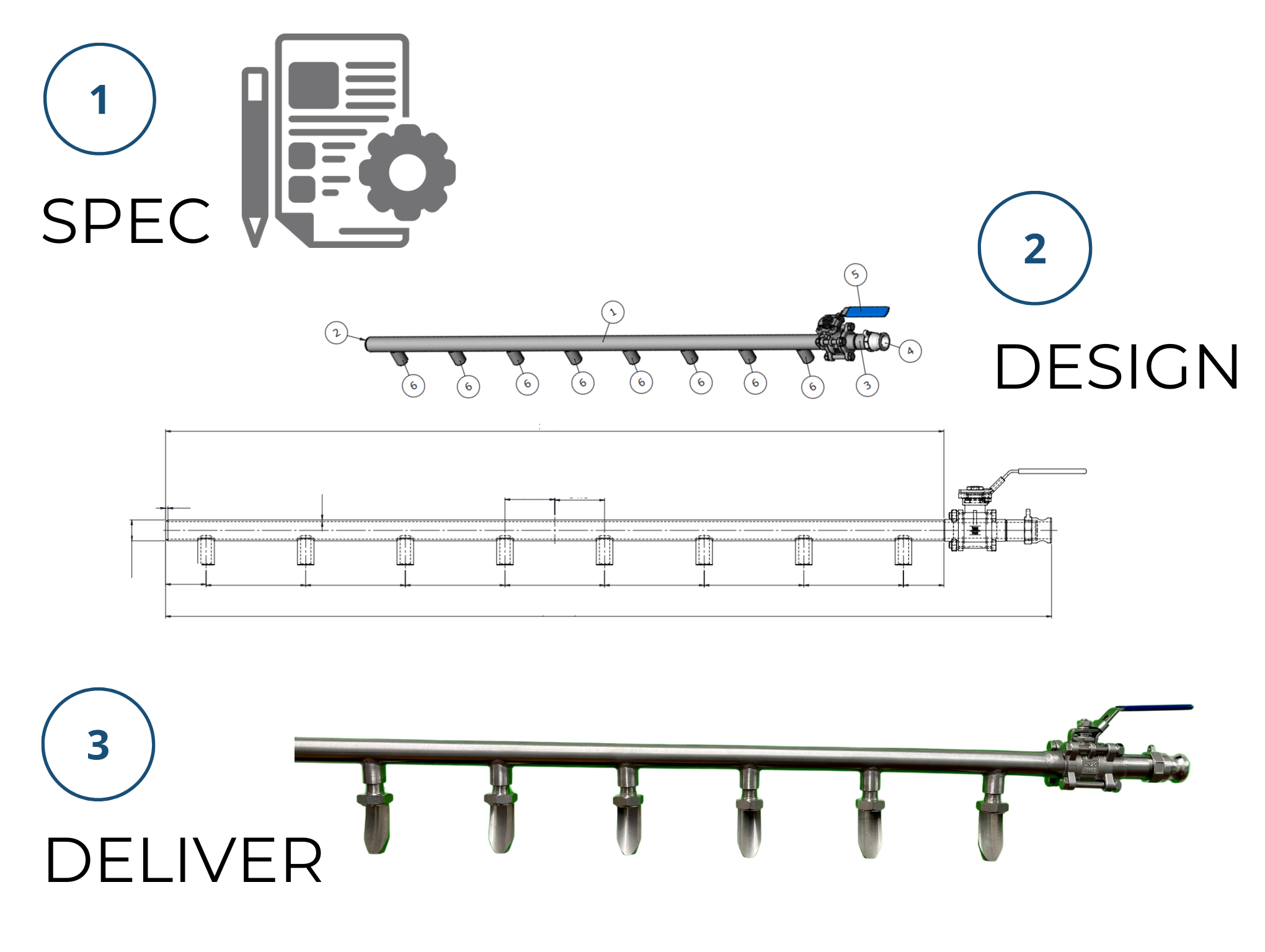 Currently, process engineers rely on multiple suppliers to deliver a functional spray bar. This adds significant project risk in the form of delays, spray bar quality issues, increased costs, and uncertainty regarding the accuracy and precision of the spray. Often, process and operational managers are left to deal with inefficiency costs post-installation. We make the configuration of your spray bar as easy as possible.