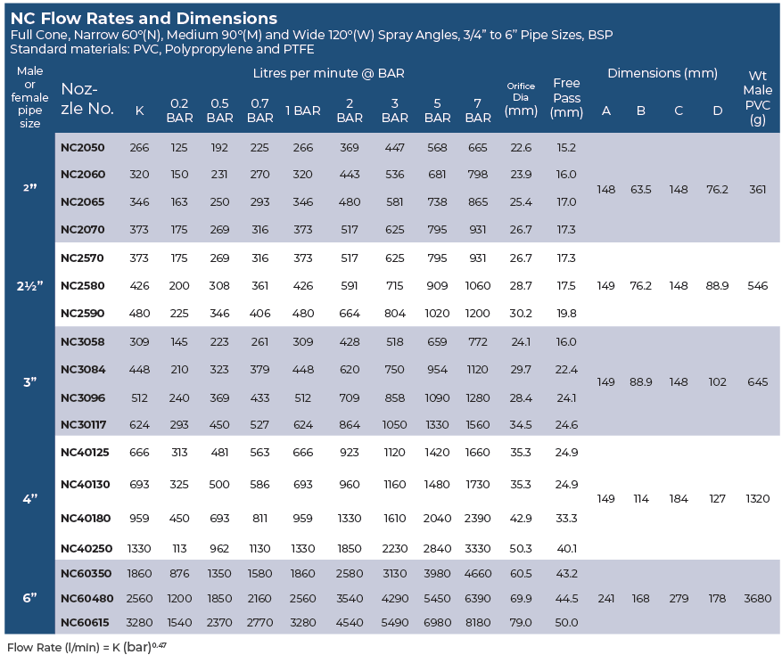 The NC nozzle is a high flow rate full cone nozzle with coarse atomisation. It has an all-plastic design for maximum chemical compatibility. With a wide range of sizes and spray angles the NC is used in applications such as: Absorber Sprays Deluge Cooling Packed Bed Fluid Distribution Gas Scrubbing Mist Eliminator Washing Parts Washing And many more.