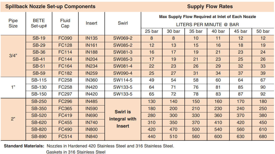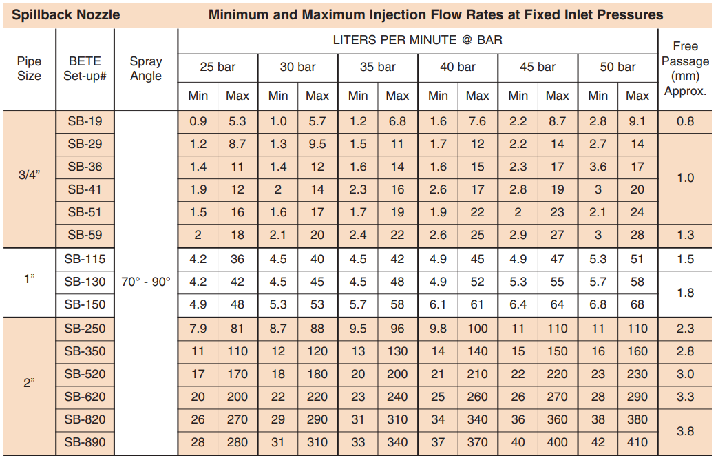 A spillback nozzle is a type of whirl nozzle that is equipped with two connections instead of the single inlet on most traditional whirl nozzles. Fluid enters the swirl chamber in the fluid cap through angled holes in the swirl component that impart a tangential velocity to the fluid. As the fluid exits the fluid cap orifice, the tangential velocity creates a cone pattern and atomization of the fluid. Spillback nozzles achieve a 10:1 turndown ratio of the injection flow rate by diverting a portion of the flow rate through an internal return line, using a spillback valve in the return line to adjust the return flow rate. An increase in flow rate through the return line results in a decrease in injection flow rate through the orifice. A constant supply pressure maintains liquid velocity through the internal swirl disk component, providing relatively constant atomization throughout the flow range.