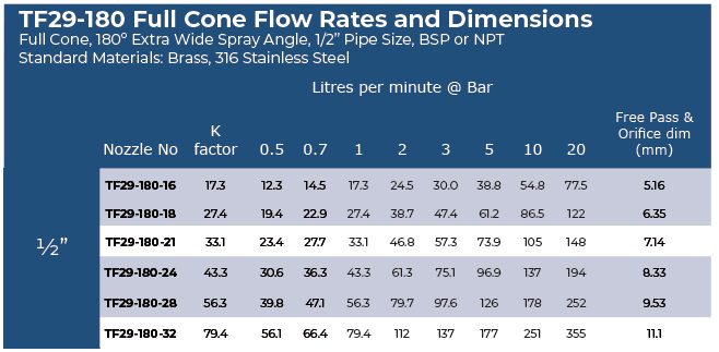 The TF29-180 is an ultra-wide full cone nozzle used in deluge applications in fire protection where there is little distance between the nozzle and the material being protected.