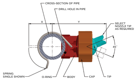 The ball socket holder allows for spray direction to be adjusted easily for optimum coverage.  The quick release coupling holds the nozzle to the riser and allows for easy removal of the nozzle for cleaning.  A double clamp holder is also available for higher pressure cleaning.