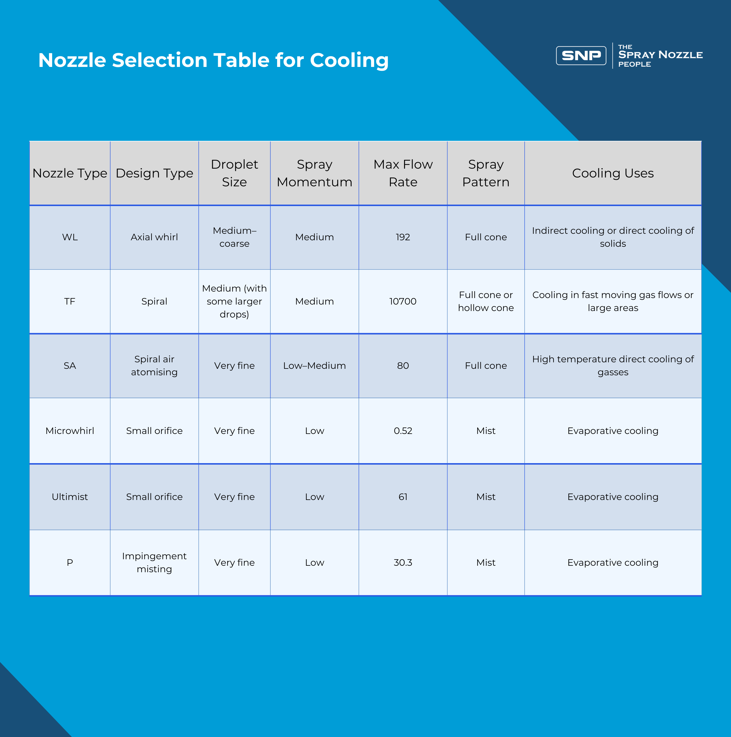 The table below summarises much of the information in the cooling systems section of the SNP website. It is intended to be a handy reference guide to aid nozzle selection. Full data on each of the nozzles listed can be accessed by clicking on the nozzle icons below the cheat sheet.