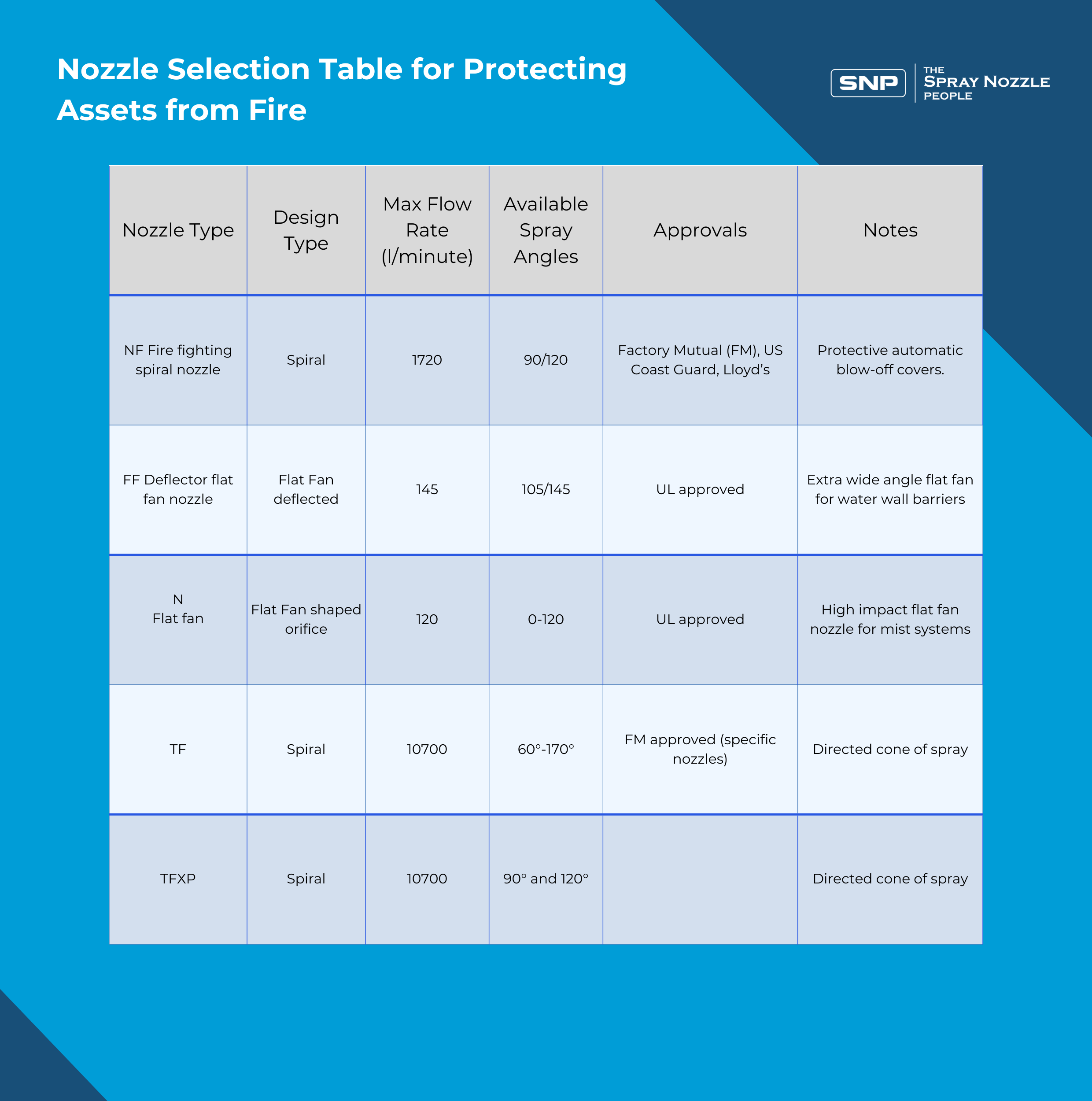 The table below summarses much of the information in the fire protection nozzle section of the SNP website. It is intended to be a handy reference guide to aid nozzle selection. Full data on each of the nozzles listed can be accessed by clicking on the boxes in the left hand column of the table below. The data sheets will open in a separate tab to allow easy comparisons between multiple product sheets.