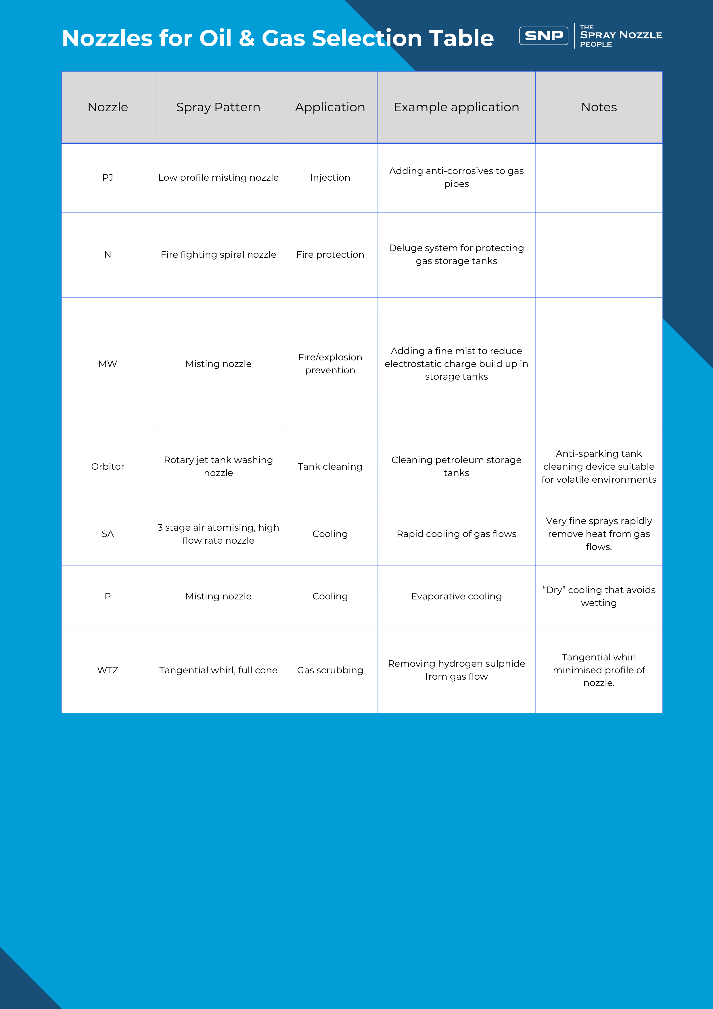 The table below summarises much of the information in the oil, gas and petrochemical industry section of the SNP website. It is intended to be a handy reference guide to aid nozzle selection. Full data on each of the nozzles listed can be accessed by clicking on the boxes below. The data sheets will open in a separate tab to allow easy comparisons between multiple product sheets.