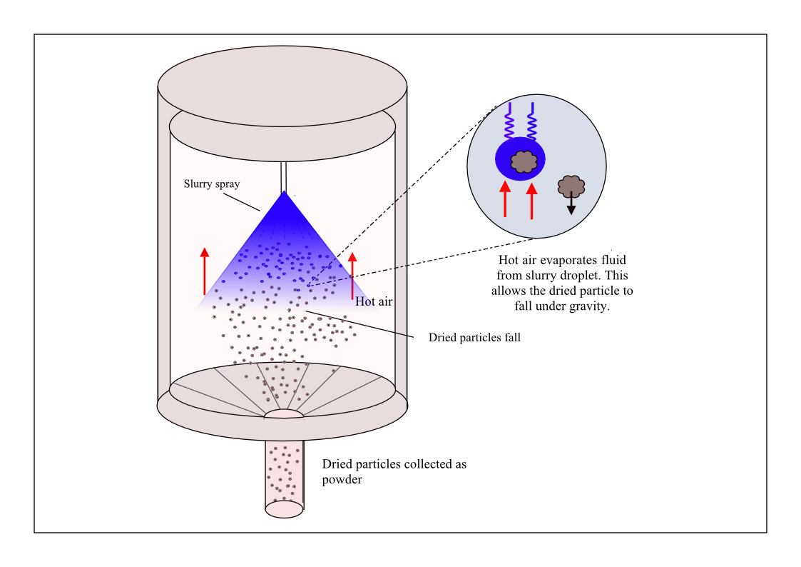 The function of nozzles in spray drying is to control the feedstock flow rate and distribute atomised droplets/particles uniformly into the heated drying chamber. Spray dry nozzles operate at higher pressures or utilise air atomising techniques to produce droplets in the 30 – 120 micron range. Surface area is maximised to the volume of the particles, allowing them to dry much quicker than other drying methods. In many dryers, evaporation is 95% complete within seconds.