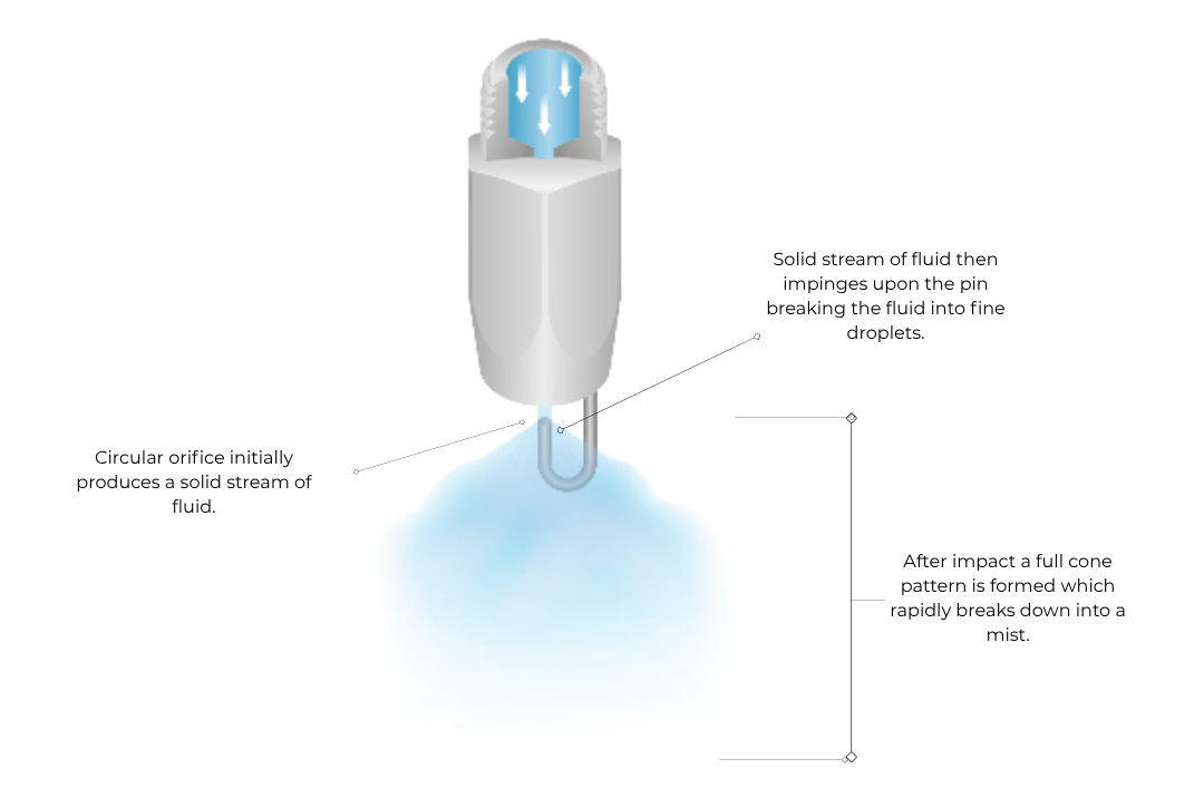 With this design of nozzle the fluid is ejected from the nozzle orifice and impacts upon a pin in the direct path of the water flow. This breaks up and disrupts the flow into a fine spray cone. As the fluid is being broken up by impact, as opposed to by being forced through a very small orifice, this allows for a larger orifice than other mist nozzle designs thus allowing for more viscous or 'dirty' fluids to be sprayed into a mist pattern. One potential downside of this design is the propensity for dripping to occur under the impingement pin.