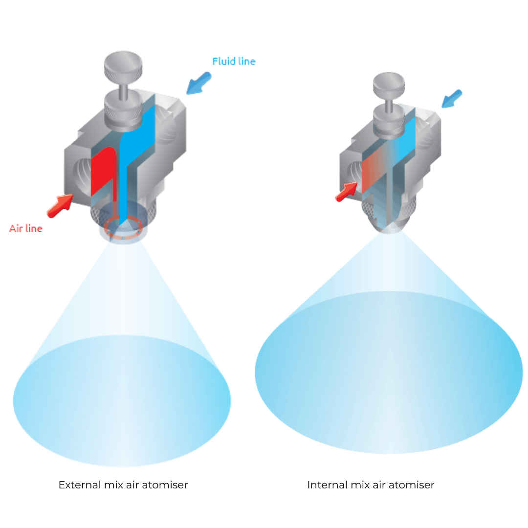 These nozzles use a secondary fluid or gas to break up the primary spraying fluid into an exceptionally fine spray (atomisation). The secondary fluid is usually air, but can be any gas, but the term air atomising is used for all.