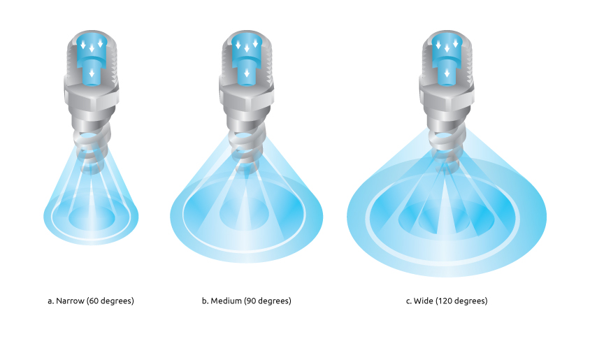 Spiral nozzles will, for any given flow rate and pressure, produce a full cone spray with the smallest droplet size for any direct pressure nozzles.