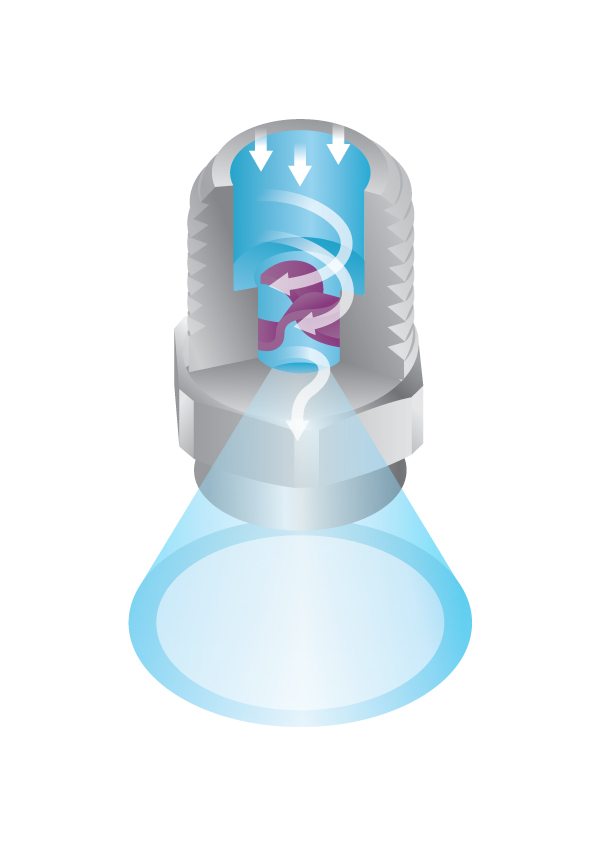 With this design of hollow cone nozzle the fluid is set into a whirl motion by an internal vein or whirl chamber. The resulting turbulence breaks up the liquid into droplets which are then shaped in to a hollow cone pattern as they exit the orifice.