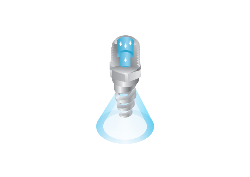 The spray pattern is formed by impacting the fluid onto a protruding helix after exiting from the spray orifice. The liquid then shears off the helix, breaking into droplets and forming the spray pattern. Spiral nozzles are often used to produce a full cone pattern but this is actually made up of concentric overlapping hollow cone patterns, so with careful crafting of the spiral geometry the concentric patterns can be made to completely converge giving a single hollow cone.