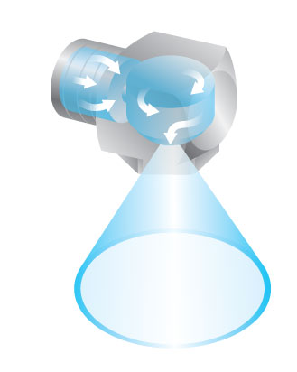With this design of nozzle the fluid is initially in motion perpendicular to the final spray direction. The fluid travels down the pipe and is twisted through 90° in a whirl motion causing it to break up into droplets before exiting the spray orifice. The exit orifice is offset from the centre line to assist with the creation of whirlpool like motion. The natural centrifugal forces of the rotating fluid tend to concentrate it at the edges forming a hollow cone pattern.
